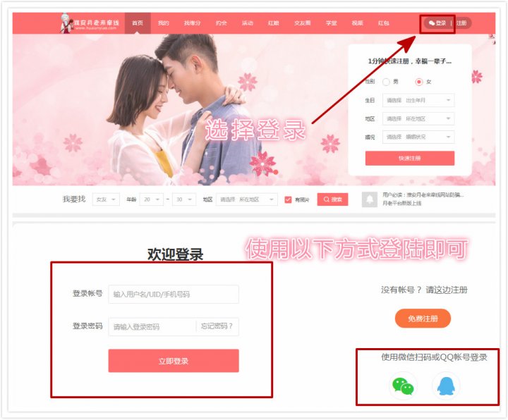 点击网址进入月老平台,点击“登录”-选择任一登录方式即可
