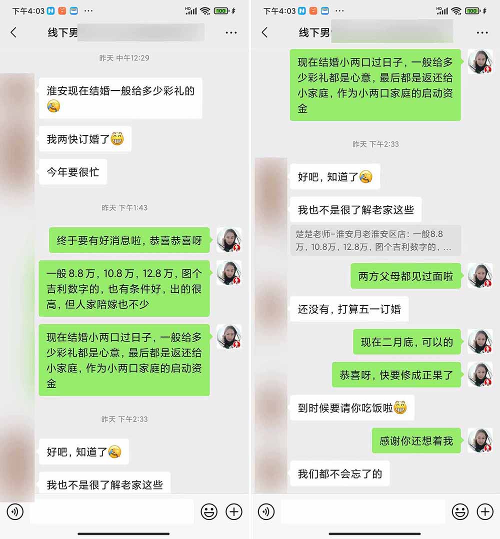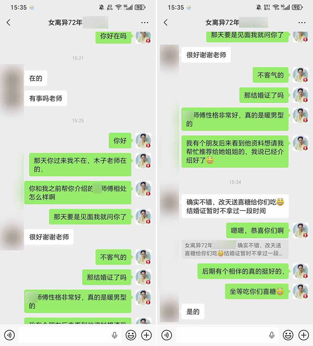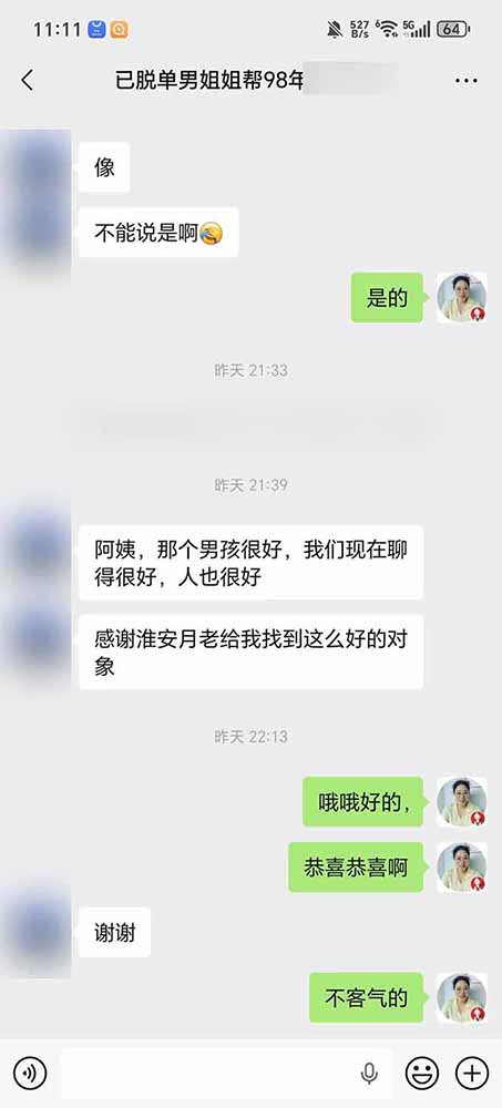 我们月老平台上登记的宝子,除了淮安市区周边外,金湖洪泽也有登记的男孩女孩。而要分享的这一对就是一位在金湖工作,一位在洪泽工作,在红娘的介绍下成功脱单,五一准备见家长了,期待他们的好消息。