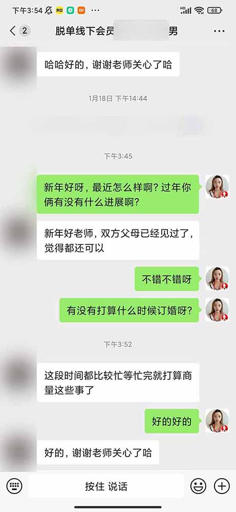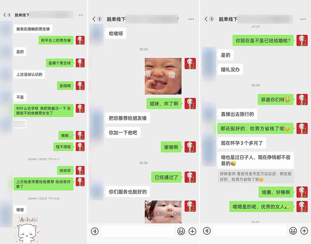 除了上面的脱单案例外,还有很多的宝子脱单了,还有宝子在脱单路上前行……不管你现在是什么样的阶段,你要坚信努力了就会有结果的。如果努力的没有结果,就需要人工干预咯,可以找我们红娘老师给你好好分析一下,给你最好的脱单方案。